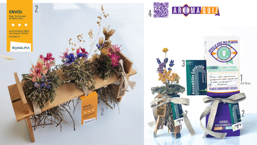 5. Diffusion de connaissances et de savoir-faire. Animation avec un QR Code. Un quiz questionne et renseigne sur les différentes plantes aromatiques, le savoir-faire des producteurs partenaires, les manifestations du territoire en lien avec les plantes aromatiques, et la méthode de conception qui a permis de réaliser ce projet, elle reprend les principes de l’économie circulaire et de la redirection écologique.